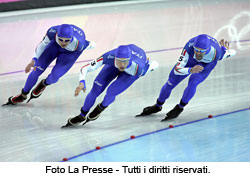 Enrico Fabris, Ippolito Sanfratello, Matteo Anesi, Stefano Donagrandi, formano la squadra che ha vinto il titolo olimpico nell'inseguimento a squadre. I tre azzurri che hanno disputato la storica finale superando il Canada sono Fabris, Sanfratello e Anesi. In pista si sono affrontate la squadra che detiene il primato mondiale (Canada 3:39.69) e quella che detiene il record olimpico (Italia 3:43.64). Impressionante il ritmo impresso fin dal primo giro dagli azzurri che hanno sfruttato proprio nei primi metri una indecisione dei canadesi incrementando il vantaggio in maniera determinante. A metà gara il ritorno del terzetto canadese composto da Arne Dankers, Steven Elm, Justin Warsylewicz è durato poco più di due giri. Ma gli azzurri hanno aspettato l'ultima parte per sferrare una impressionante progressione che li ha portati a tagliare il traguardo in 3:44.46 con oltre due secondi di vantaggio (+2.42).